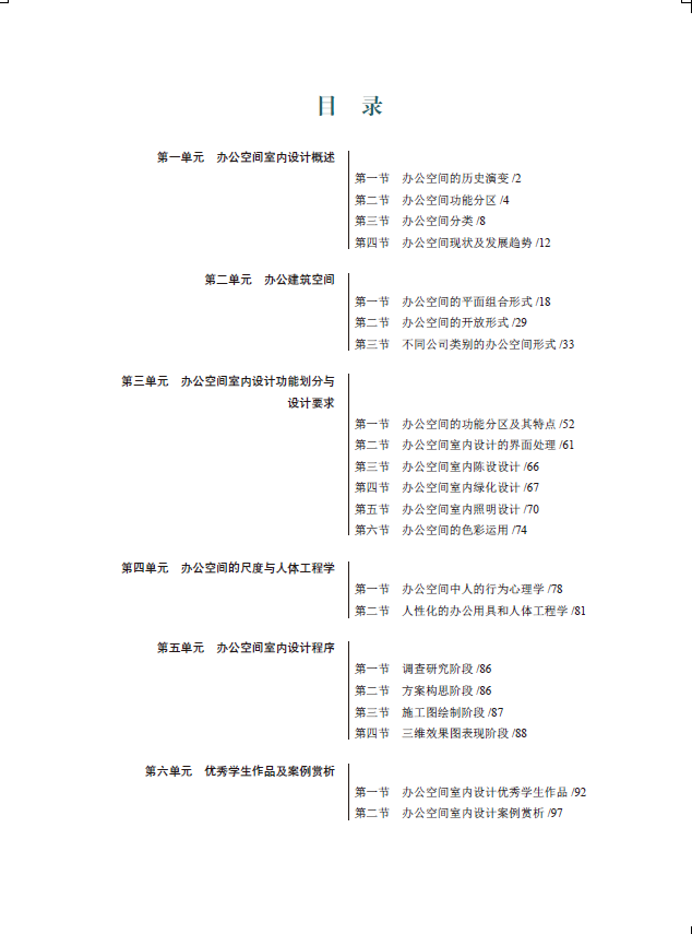 对于环境设计专业的学生来说,专业知识和修养是十分重要的,没有这些将会影响想象力和创造性的发展。因而,在教学的过程中,教师要特别注意引导学生阅读实物和图片,科技化、信息化、人性化的现代办公空间的发展方向为我们提供了良好的契机。本书收录的经典案例与图片则为教学工作提供了丰富的范例。