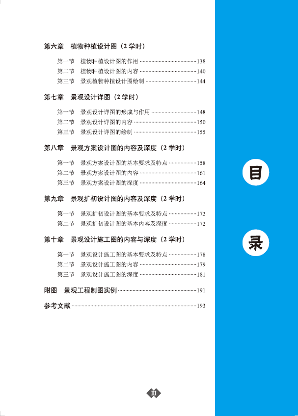 随着我国景观设计行业的迅速发展, 景观设计从业人员也逐渐增多。 然而, 部分从业人员缺乏对景观设计专业制图知识及规范的了解和掌握, 影响行业的专业化和规范化。 目前市场上的景观设计制图类教材内容大多是对制图的基本知识的介绍, 对在实际的制图过程中所涉及的有关详细的规范性要求和工程图纸的不同深度表现较少。因此, 景观设计专业迫切需要一本适合行业需求的应用型人才培养方面的教材。