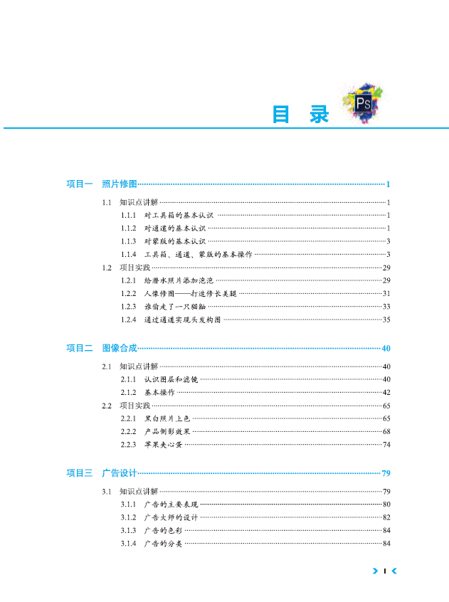 全书共分七个项目, 分别介绍照片修图、 图像合成、广告设计、 标志与图形、 平面与版式设计、 UI 概论、 后期平面处理。
