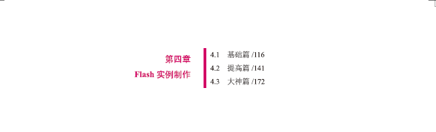 笫四章主要针对 Flash 实例制作,分为基础篇、 提高篇、 大神篇,让初学者从简单到难对网络动画有个全面的了解。