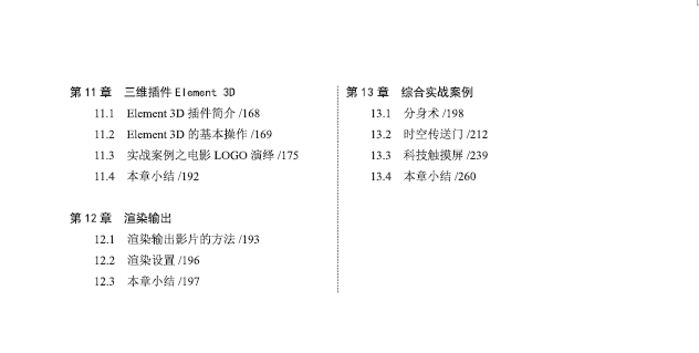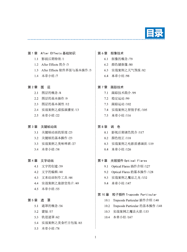 本书在设计的过程中, 始终以 “应用性” 为指导思想, 重在培养学生的操作技能和实践本领。 基于这一思路, 本书以After Effects为教学软件, 从基础的入门知识开始, 由浅及深, 循序渐进, 不但详细讲解了After Effects各种重要功能的相关知识与实践应用, 还讲解了一些重要插件的使用方法和操作技巧, 使学生从入门就打下坚实的基础, 在案例中学到知识、 锻炼技术。本书内容丰富、 案例精彩, 对于教学具有一定的启发性。