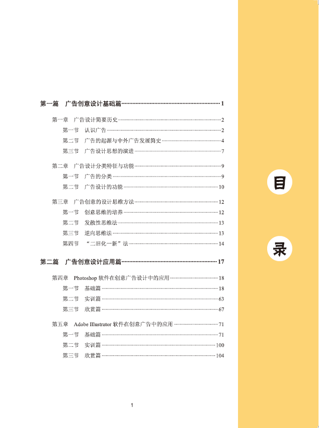 本书主要通过三个大的方面来诠释广告创意设计。 首先是广告创意设计基础篇, 主要介绍了广告设计简要历史、 广告设计分类特征与功能、 广告创意与设计;其次是软件基础篇, 主要介绍Photoshop、Illustrator两种软件在几种常用广告形式中的应用;再次是广告制作氐,主要介绍了平面广告创意设计中接触到的实用的制作方法, 如手绘POP海报、 丝印POP海报、 丝印标牌制作、 喷绘广告制作(包括户内与户外广告喷绘方式与方法)等。 该书主要围绕广告与视觉传达专业,比较全面系统地介绍了广告从创意到电脑制作在到制作的全过程。 该书旨在让读者学到有用的广告创意方法与制作方法,主要针对广告中平面广告创意与设计来讲授。