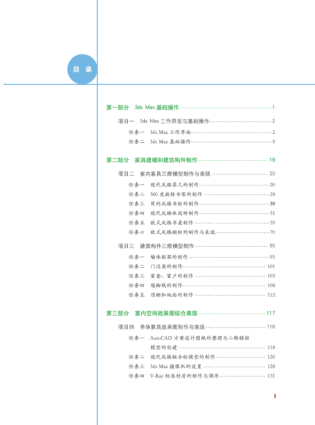 笫四, 本书内容主要包括3ds Max基础操作、 家具建模和建筑构件制作以及室内空间效果图综合表现三个部分, 紧扣建筑室内设计专业的教学培养目标。